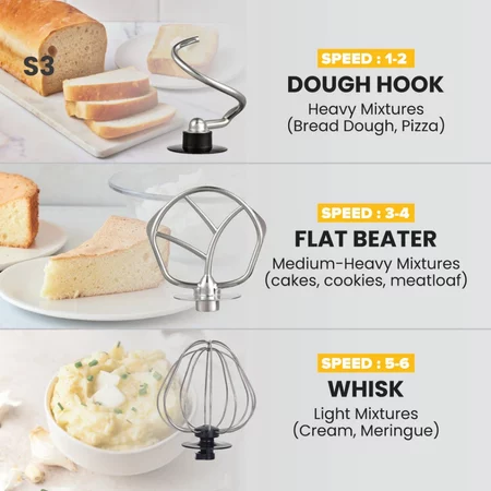 📌 1-3 Speeds: Heavy mixtures (bread dough, pizza) – Dough Hook (Max 20 minutes)