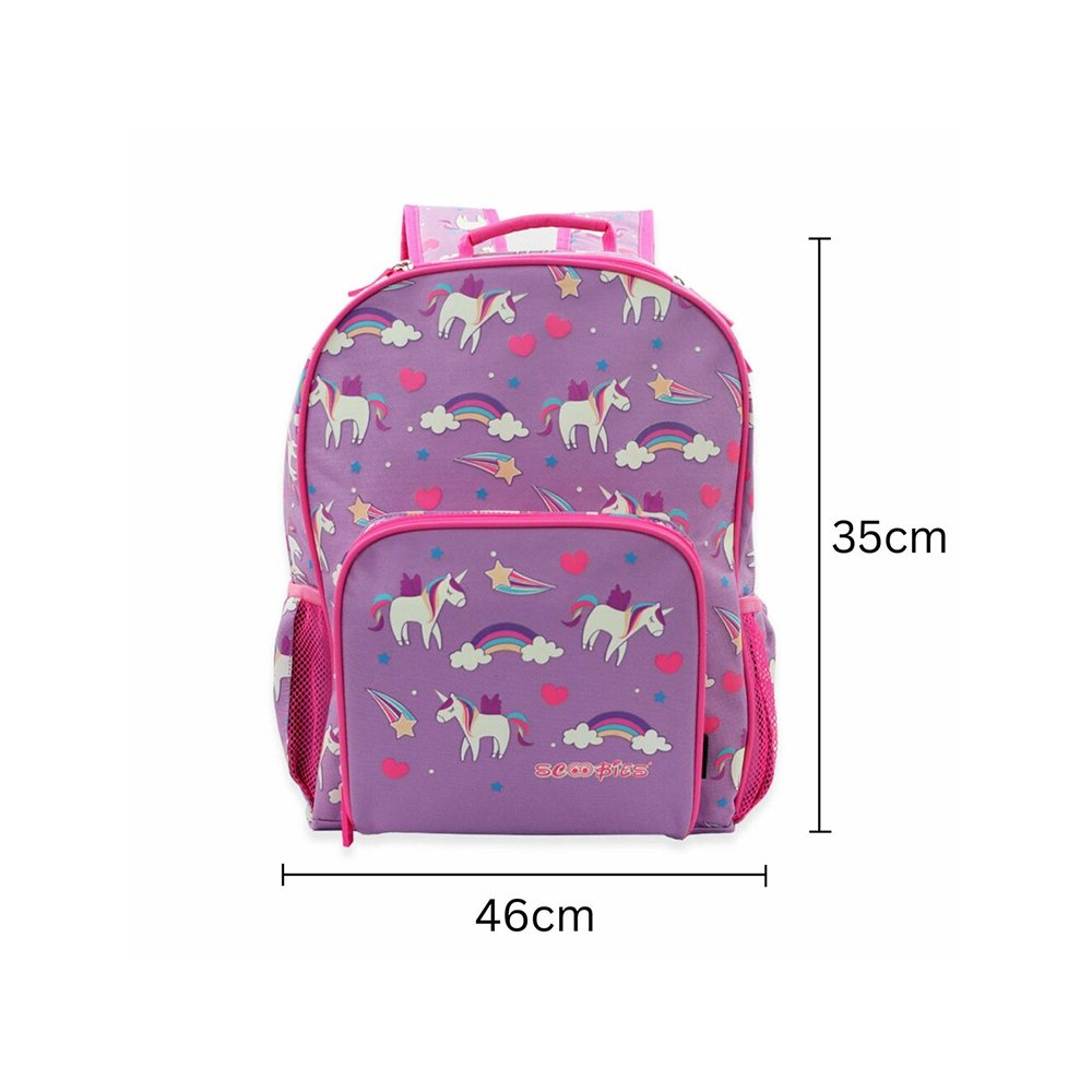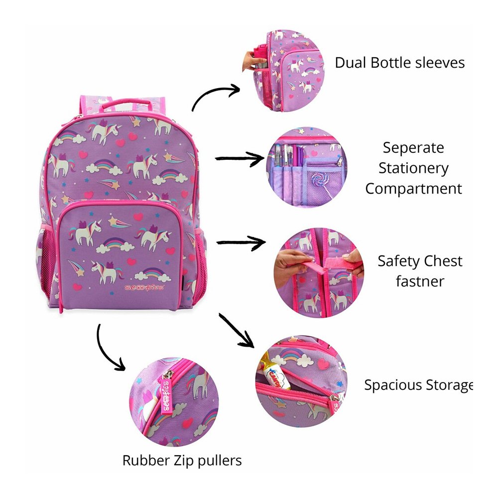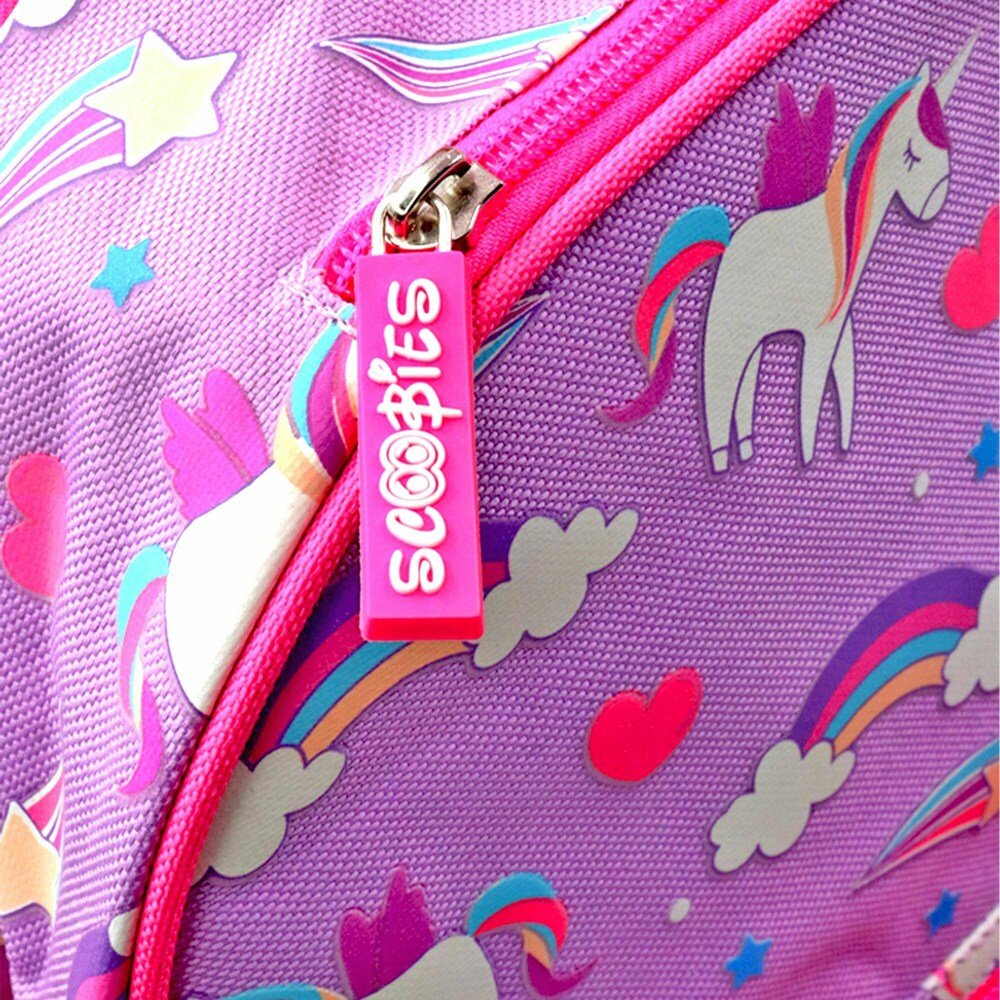 - Alluring Design – This pink & purple colored backpack comes with beautiful icons like Unicorn with a pony, hearts, rainbow, and stars along with other cute elements.